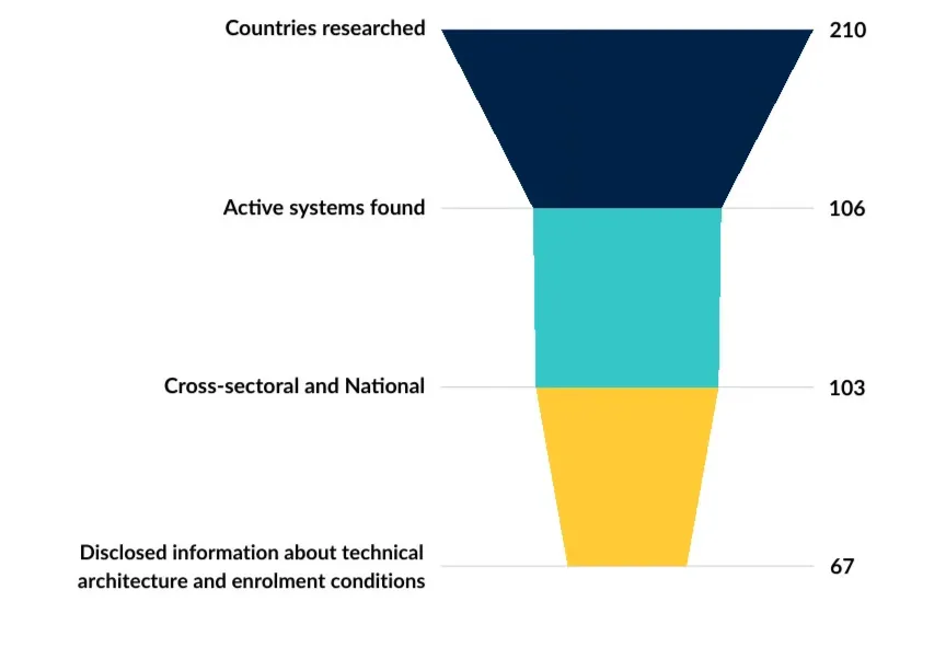 A top-level scan of deployments of identity systems, digital payment systems and data exchange systems across 210 countries has identified: