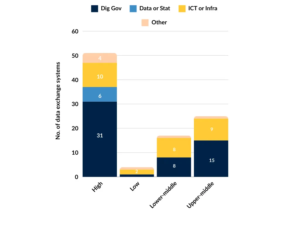 Regardless of income classification, over half of these systems are found to be managed by units associated with Digital Government (e.g., digital transformation, digitisation, e-government). This trend indicates a global perspective that positions data exchange as a component of Digital Public Infrastructure (DPI), under the purview of specialised units, rather than as a matter for Telecommunication or Infrastructure agencies (29 countries), and even less so for Data Management or Statistics departments (6 countries).