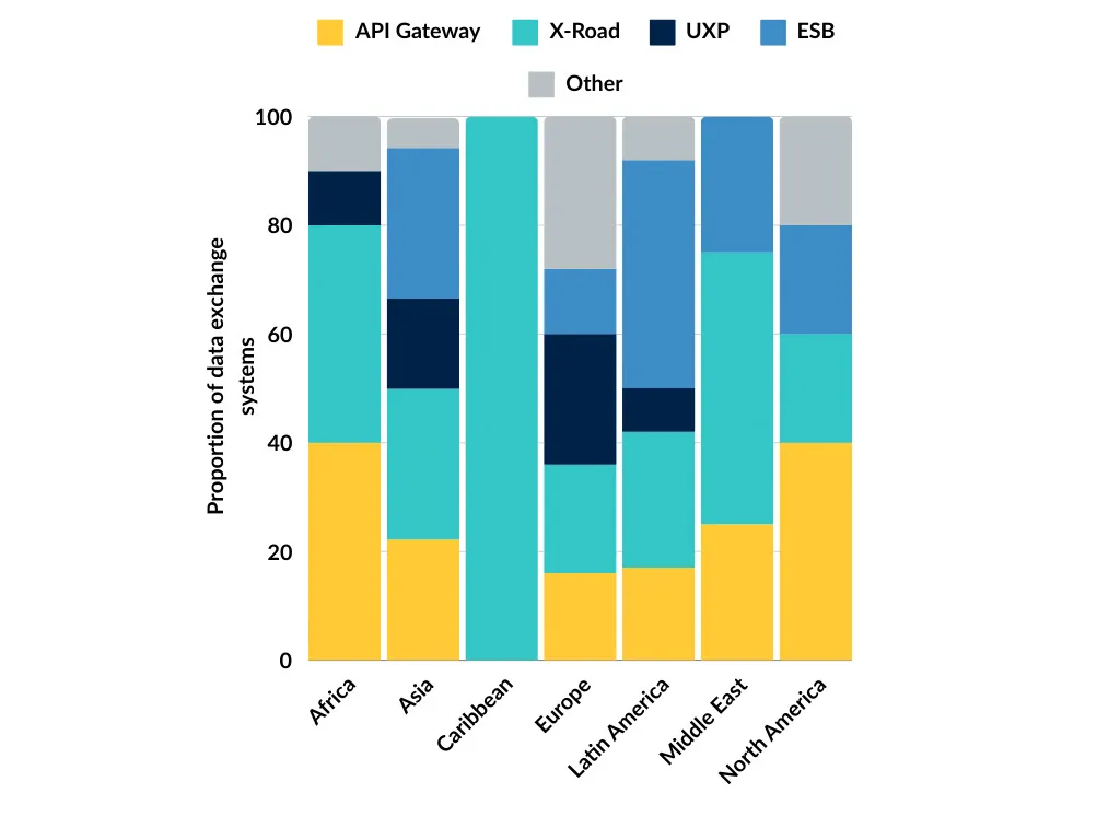 Of the 103 countries with an active data exchange system, 61 revealed information about the technical architecture their system leverages. Among these, API Gateway, X-Road, and Enterprise Service Bus (ESB) are the most commonly reported technical architectures, with Unified eXchange Platform (UXP) by Cybernetica following. Notably, the X-Road model shows a strong presence in regions like Africa, Asia, and Europe, indicating its adoption in regions that prioritise secure, interoperable frameworks for cross-sectoral data sharing. Meanwhile, the API Gateway model is more commonly used in North America and Latin America, with some presence in Europe, reflecting a preference for customizable and flexible API management solutions in these areas.