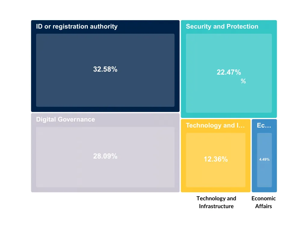 Insights on the institutional arrangements that house digital identity programs make the heterogeneity even more evident. Nearly 33% of countries manage their identity systems through a dedicated ID or Registration Authority, 28% by Digital Governance bodies, and 22% by Security and Protection institutions.