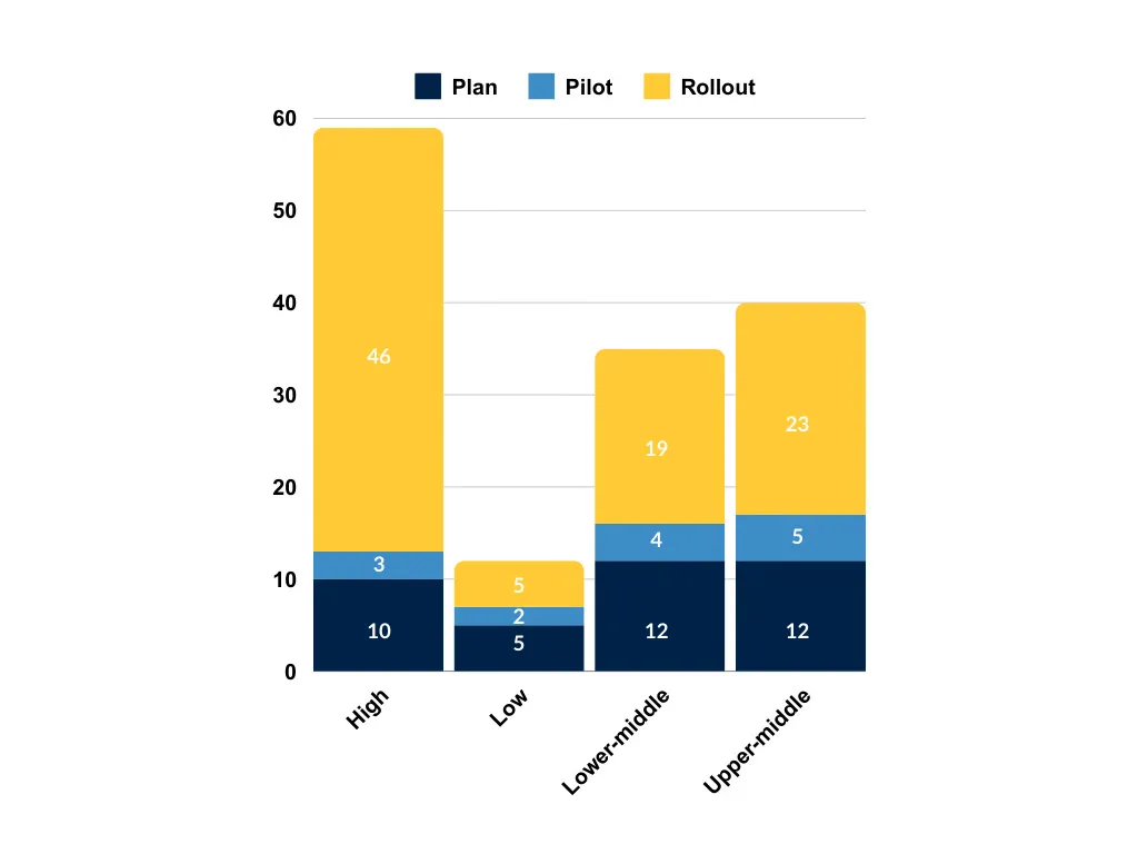 Europe and Asia have the most advanced digital identity deployments. Europe stands out with 35 systems in the rollout stage. Asia also shows a significant presence with 20 systems already in rollout. While Africa claims the highest number of digital IDs, with 54 cases, it’s important to note that nearly half of these are still in pilot or planning stages, indicating that much of the continent’s DPI initiatives are still in early phases.