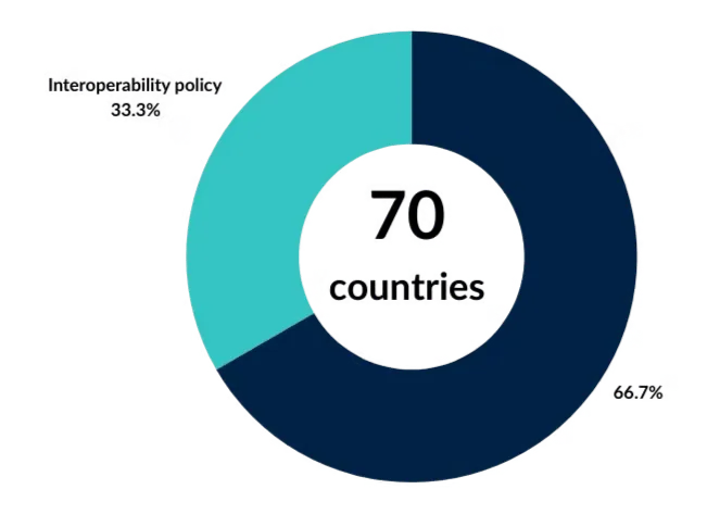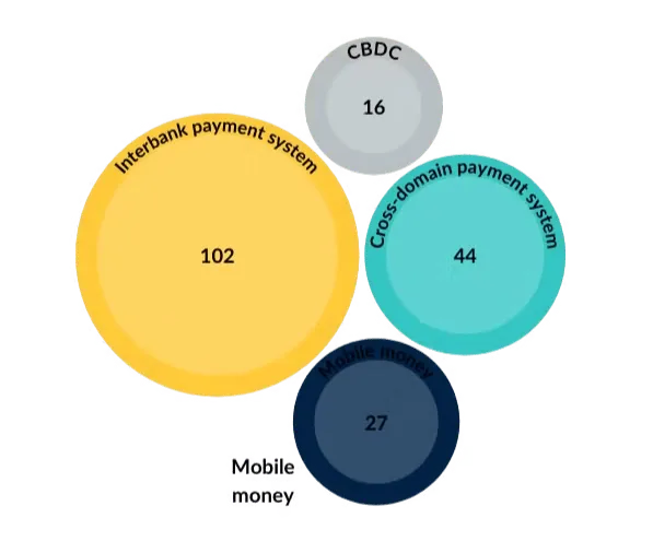 - 93 countries with digital payment systems - which includes those with at least one active digital payment system that facilitates real-time transactions and has a public interest operator. This may comprise cross-domain systems, interbank real-time payment systems, mobile money and CBDCs.